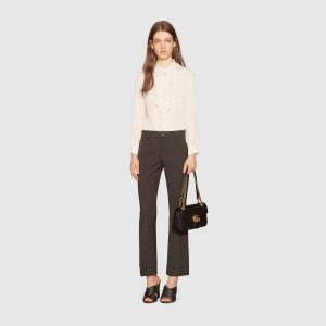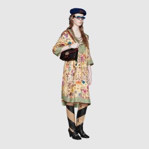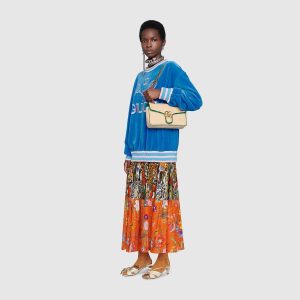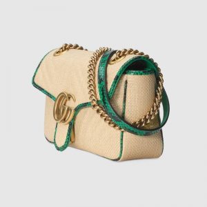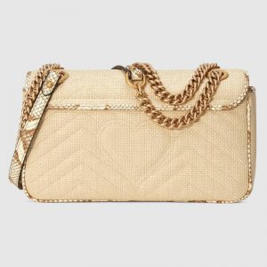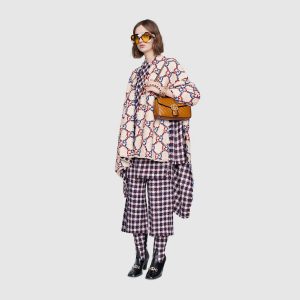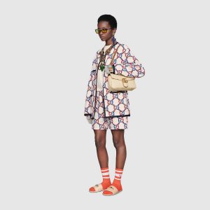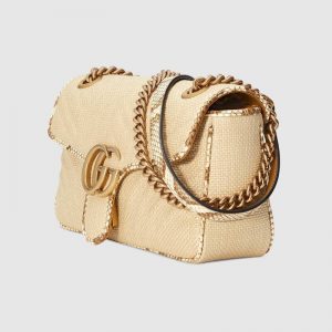 A statement Gucci accessory, reimagined with a strong logo connotation for Spring Summer 2020. Defined by the archival Double G hardware from the ’70s, the GG Marmont bag is presented in diagonal matelassé Original GG canvas—a timeless pairing that pays homage to the House’s heritage. The small chain shoulder bag’s distinct softly structured shape is outlined in contrast black leather trims, highlighting its flap closure. The sliding chain strap smoothly transforms from a single shoulder length to a doubled top handle length for multiple ways to wear the bag.